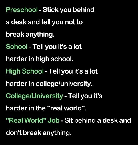 I would suggest that most “education” is designed to mold people into workers who will sit behind desks and try not to break anything, certainly not to think and take risks.