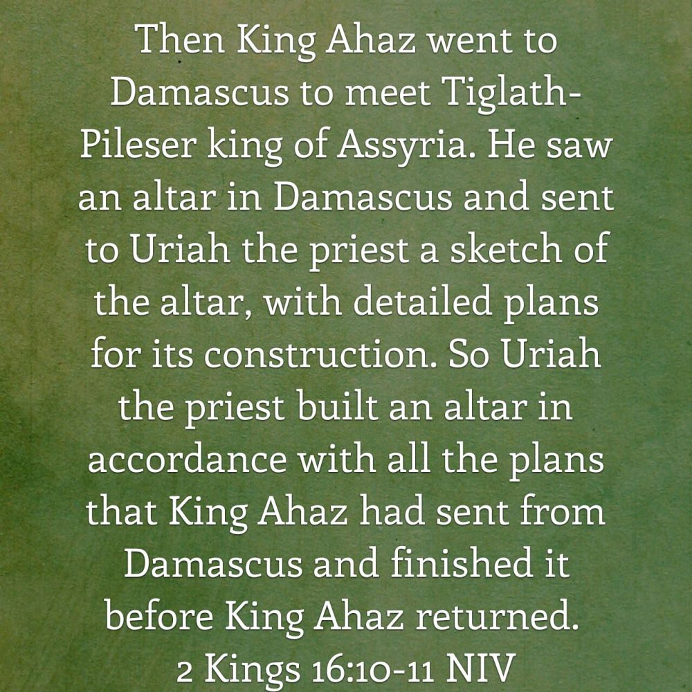 The sixteenth chapter of 2 Kings, focuses on the lengths Ahaz went to in order to protect Judah and Jerusalem. When put under siege by Israel and Aram, he showed little reluctance in using the valuable items that belonged to the temple of the Lord as payment to Assyria to gain their help in defeating their enemy. The flagrant neglect and disregard for the temple of the Lord deteriorated further when Ahaz took a trip to Damascus.