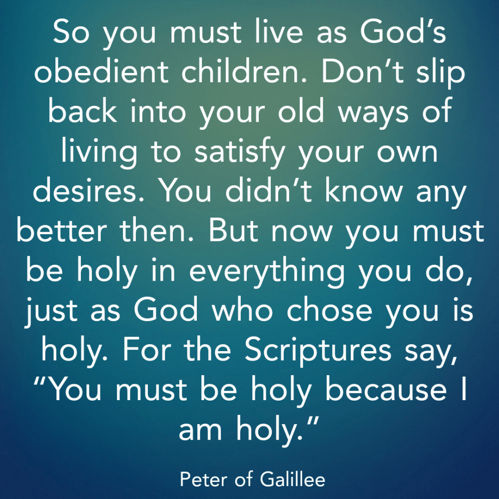 That’s why Peter’s challenge is such a pressing and prevalent one. Jesus epitomised that like Father like Son dynamic I referred to earlier. His Father was holy and he was holy in all his time on earth. That holiness radiated from Him in His teachings and the character that He backed it up with. The Father took delight in the Son, as the Son took delight in being pleasing to the Father.