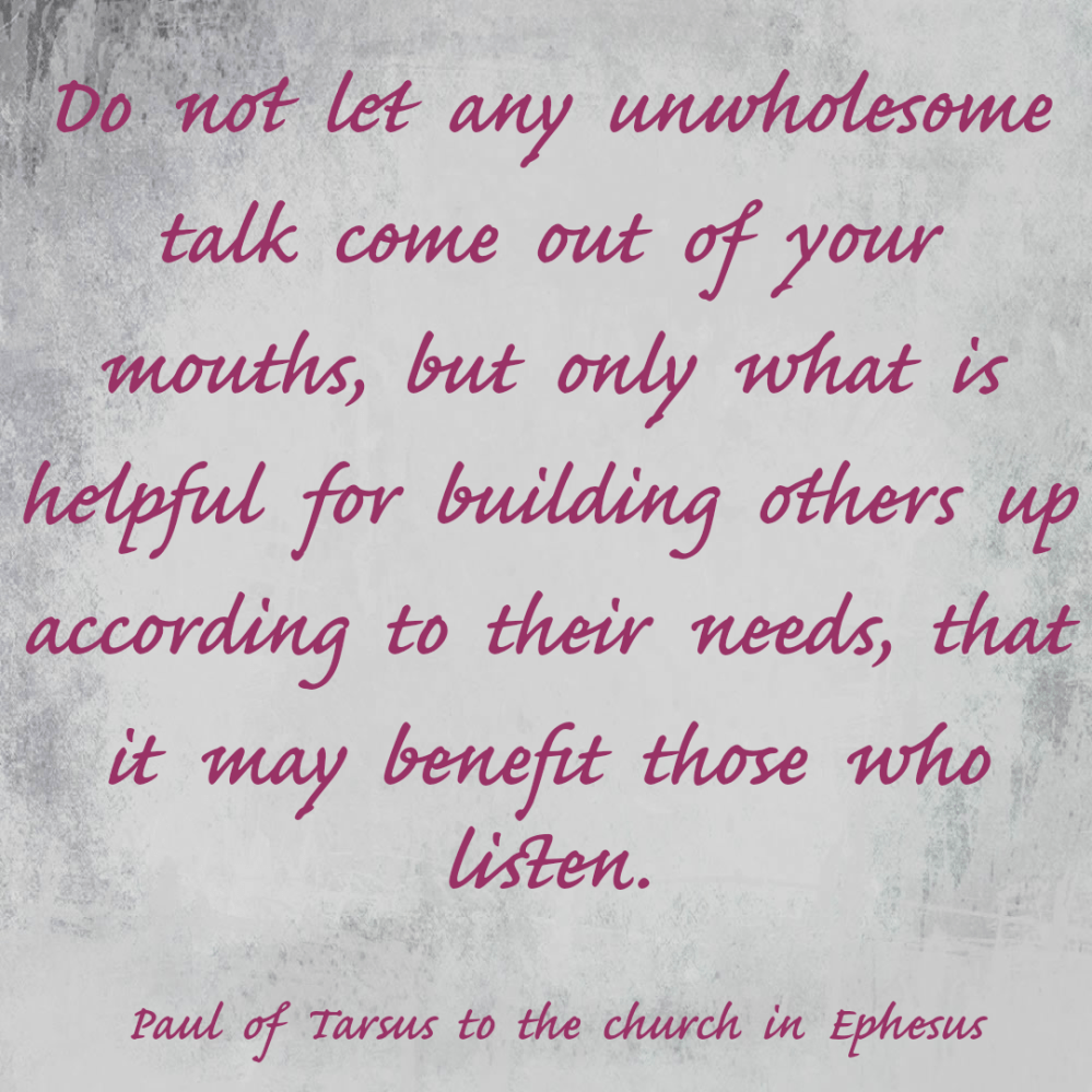 The verse has been used by some to condemn swearing. I can see where they’re coming from, but it is a lot more than just prohibiting curse words. It’s an active invitation to consider what we’re using our words for. It’s tragic to hear some use their words in an attempt to bring down others, either in anger, in malice or in gossip. No swear words are used at all and sometimes some very pious and religious terms are used in conversations that appear well meaning but are just a front for the sort of corrupting communication Paul writes about.